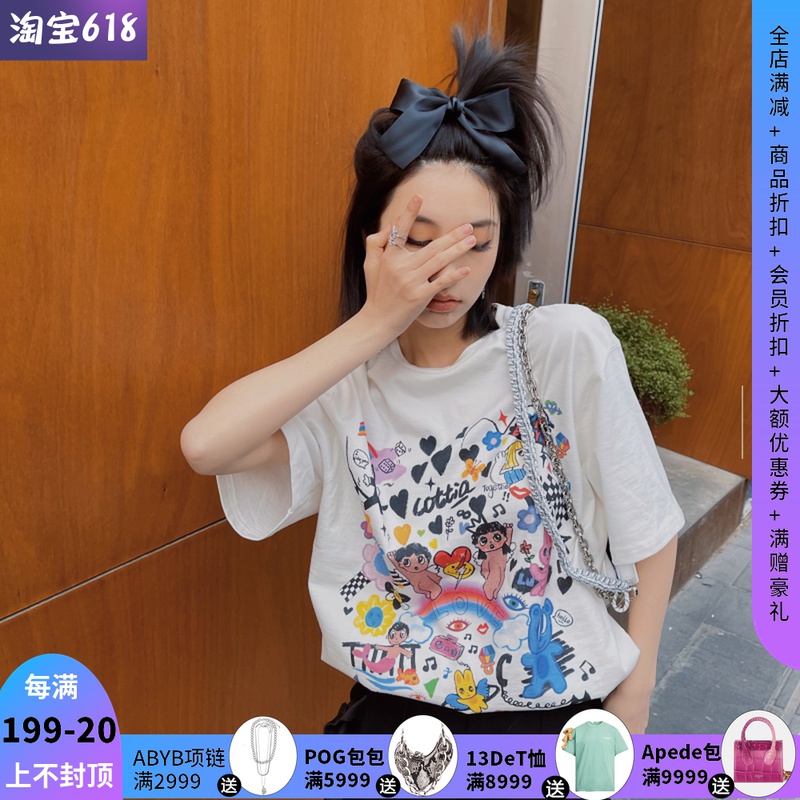 白鹿同款 原创设计师Cottia白色趣味漫画印花短袖T恤热门设计联盟服务商