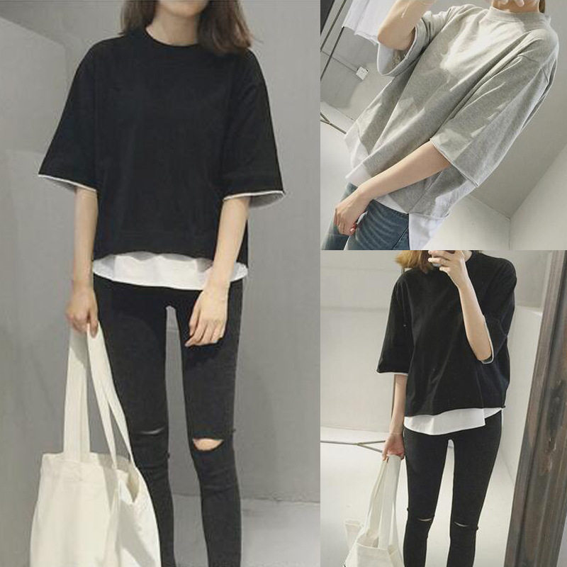 2021夏装新款韩版宽松拼接假两件短袖T恤女设计感小众潮ins包邮热门设计联盟服务商