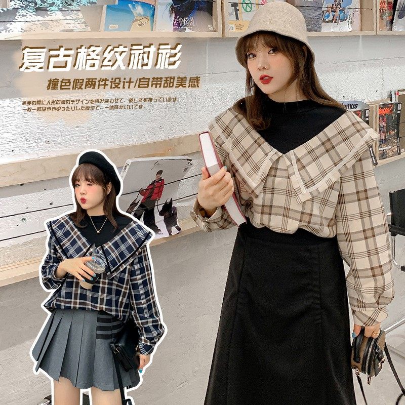 微胖新款其他春装春大码法式复古撞色格子假两件衬衫减龄洋气上衣热门设计联盟服务商