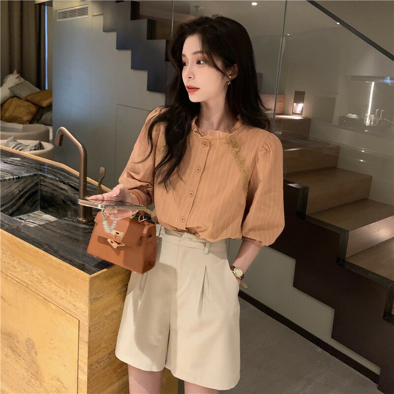 cssfit/ss 奶橘蕾丝拼接泡泡袖衬衫女夏设计感小众慵懒短袖上衣热门设计联盟服务商